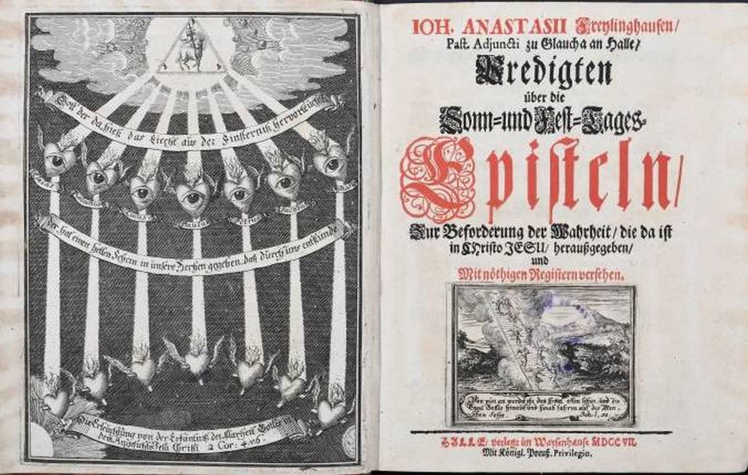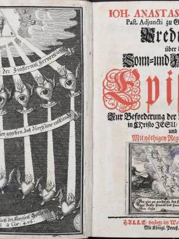Das Frontispiz in Johann Anastasius Freylinghausens (1670–1739) Predigten über die Sonn- und Fest-Tages-Episteln ist das einzige Bildbeispiel mit Herzsymbolik, das aus der Literatur des hallischen Pietismus bekannt ist. Zu sehen sind zum einen sieben geflügelte und entflammte Herzen mit je einem geöffneten, geradeaus blickenden Auge. Jedem dieser Herzen wird durch ein Spruchband ein Name zugewiesen, wodurch diese als die Herzen bedeutender Männer aus dem Alten und dem Neuen Testament identifiziert werden können. Sie sind Übermittler des Gotteswortes, was ihre Position im Kupferstich zwischen Gott am oberen Bildrand und den Christen, dargestellt durch weitere sieben Herzen mit eingeschriebenem Kreuz am unteren Bildrand, erklärt.