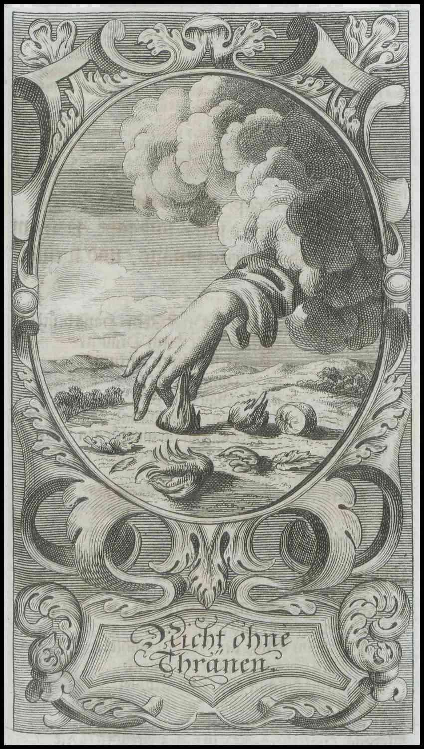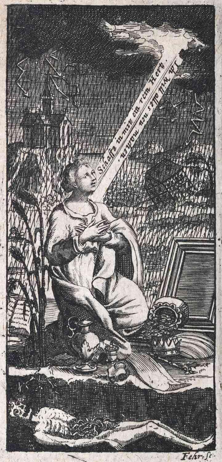 Johann Jakob Schütz‘ (1640–1690) Christliches Gedenck=Büchlein/ Zu Beförderung eines angefangenen neuen Lebens kann als eine Art Leitfaden für die »GOTT=suchende Seele« verstanden werden, der in drei Schritten den »Weg zur Seligkeit« erläutert. Auf den Frontispizen der vorliegenden Ausgaben von 1691 und 1711 wird der darin beschriebene Bekehrungsprozess, bei dem neben der Seele und dem Körper vor allem das Herz eine wichtige Rolle spielt, eindrucksvoll visualisiert. Im Zentrum des Kupferstichs steht eine junge Frau, die Gott um ein neues, reines Herz bittet. Nur mit einem solchen, weltlichen Dingen entsagenden Herz, kann der wahre Glauben erlangt werden. Dieser wird im Frontispiz von 1691 durch sieben Herzen mit eingeschriebenem Kreuz symbolisiert, die auf den am Boden ausgebreiteten weltlichen Gegenständen stehen und so das einstige Interesse der jungen Frau an diesen »überlagert« oder »überschreibt«.