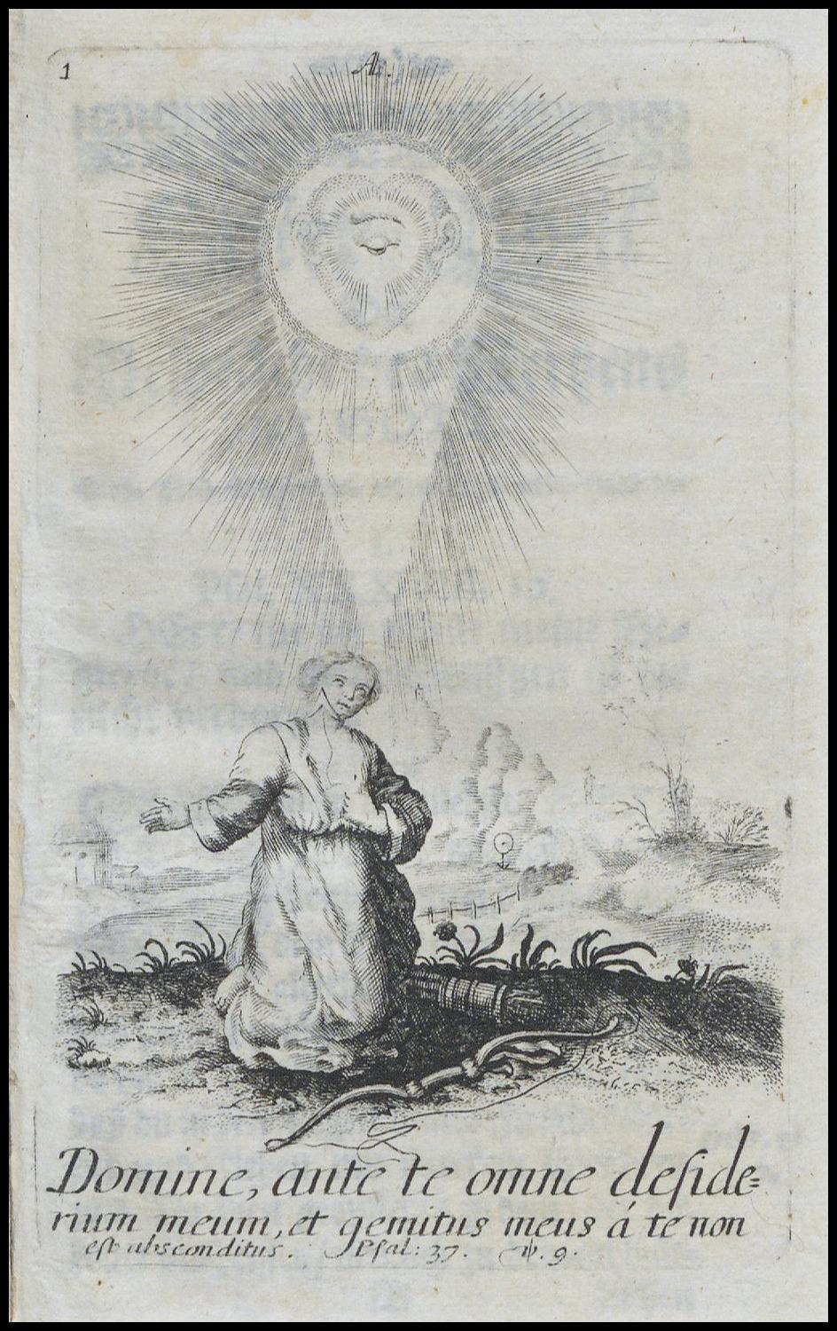 Der hier präsentierte Kupferstich zeigt die menschliche Seele in Gestalt einer jungen Frau, die sich im Zwiegespräch mit Gott befindet. Der Kupferstich bildet den Ausgangspunkt für die »Hertzens-Gespräche«, seine Position vor der ersten Gebetsmeditation ist deshalb nicht zufällig gewählt. Die Seele schaut auf Richtung Himmel und sucht (Blick-)Kontakt mit Gott. Interessant ist hierbei die Darstellungsweise Gottes, dessen allsehendes Auge und dessen Ohren nicht, der Vorlage in Hermann Hugos Pia Desideria folgend, in einer Wolke, sondern in einem Herzen dargestellt sind. Dies hat Einfluss auf die Deutung der Szene: Anders als in der Vorlage liegt der Fokus nicht auf der Gewissheit vor Gott, sondern auf dem Herzen, in dem diese empfunden wird.