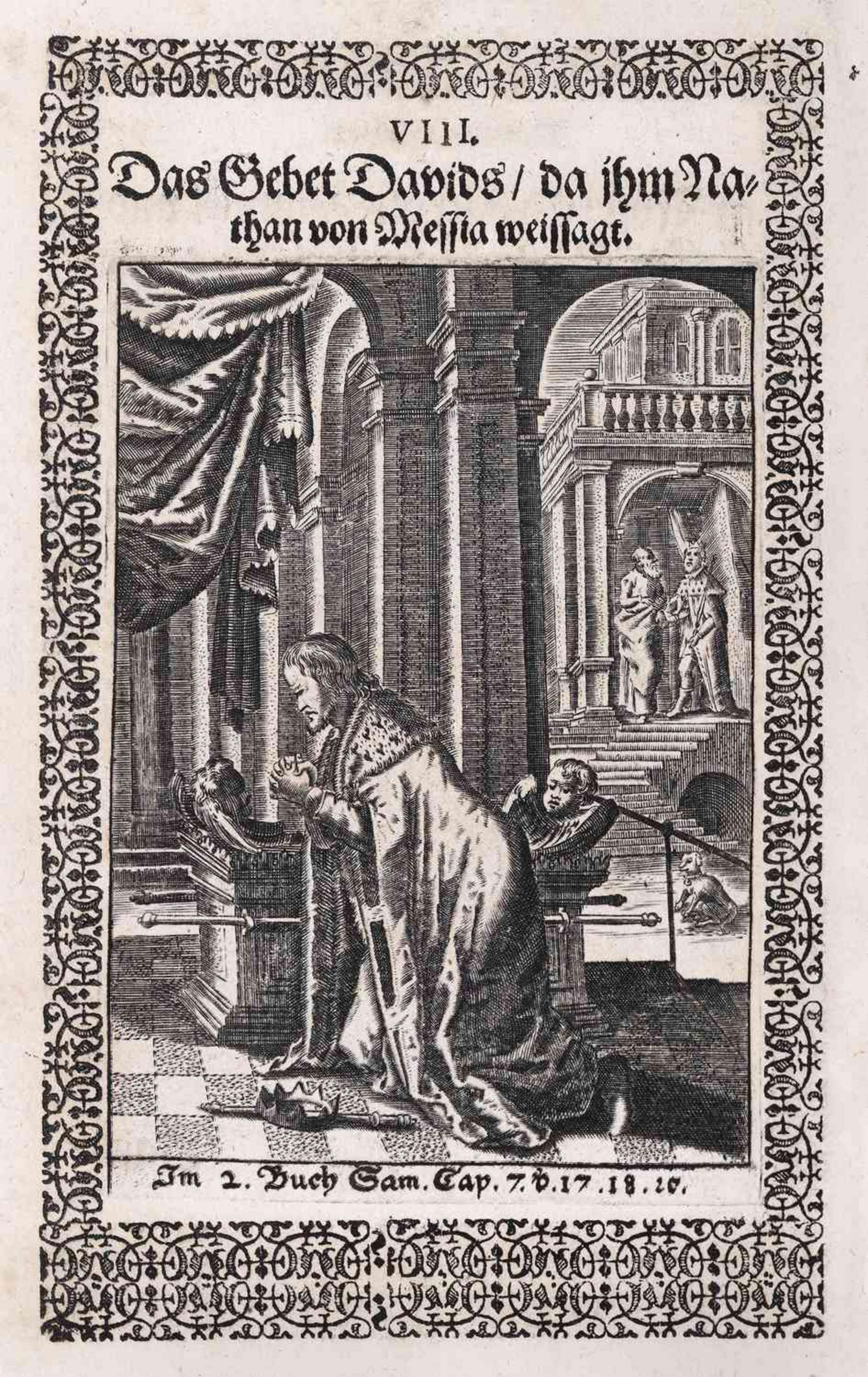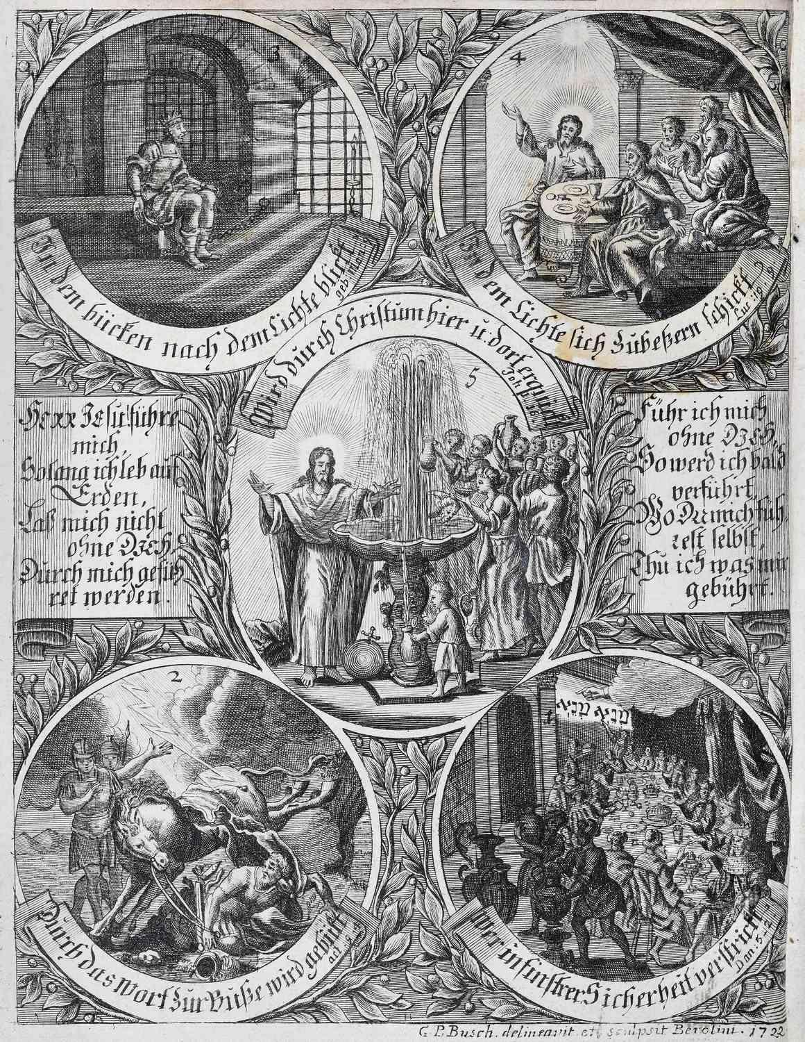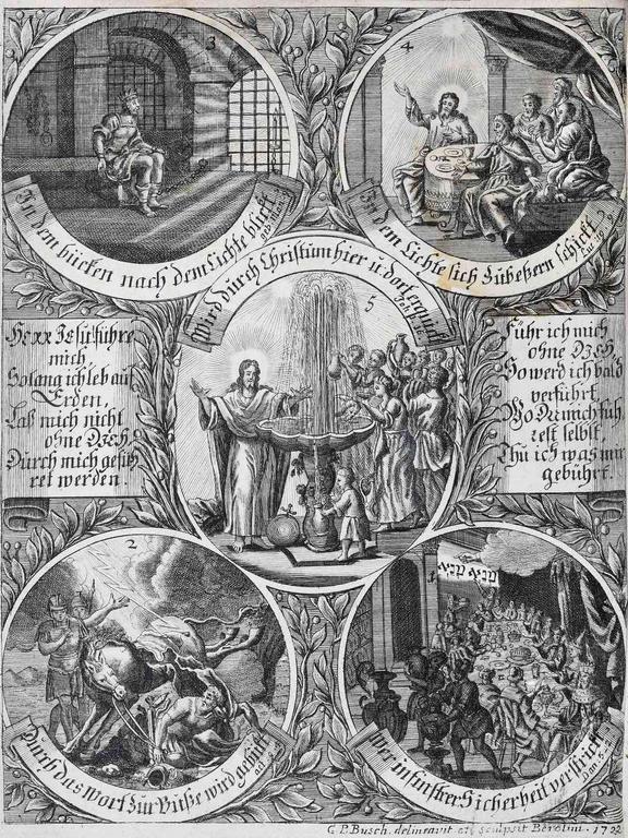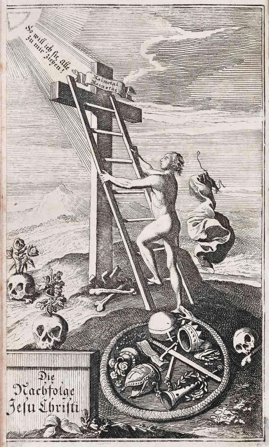 »Die Nachfolge Christi«. Bild V aus Reitz` Bildprogramm ist dem ebenfalls von Reitz` verfassten Lehrtraktat Die Nachfolge Jesu Christi von 1707 entnommen und stammt von dem Kupferstecher Gabriel Uhlich (1682–1741). Die Seele steigt nackt von der Schädelstätte auf einer Leiter zum Kreuz empor und lässt alle Attribute der Welt, umschlossen vom Teufelsring der Schlange, auf der Erde zurück. Eindringlich und drastisch wird so ihre Nachfolge auf dem Leidensweg Christi sowie die im Pietismus häufig genutzte Metapher vom ,Ausziehen des alten Adams‘ als Voraussetzung der Teilhabe an der Gnade Gottes versinnbildlicht. Die auf der Erde liegenden Totenköpfe, aus denen Blüten, Ähren und Reben hervorwachsen, stehen für das neue Leben, das Tod und Teufel überwindet.