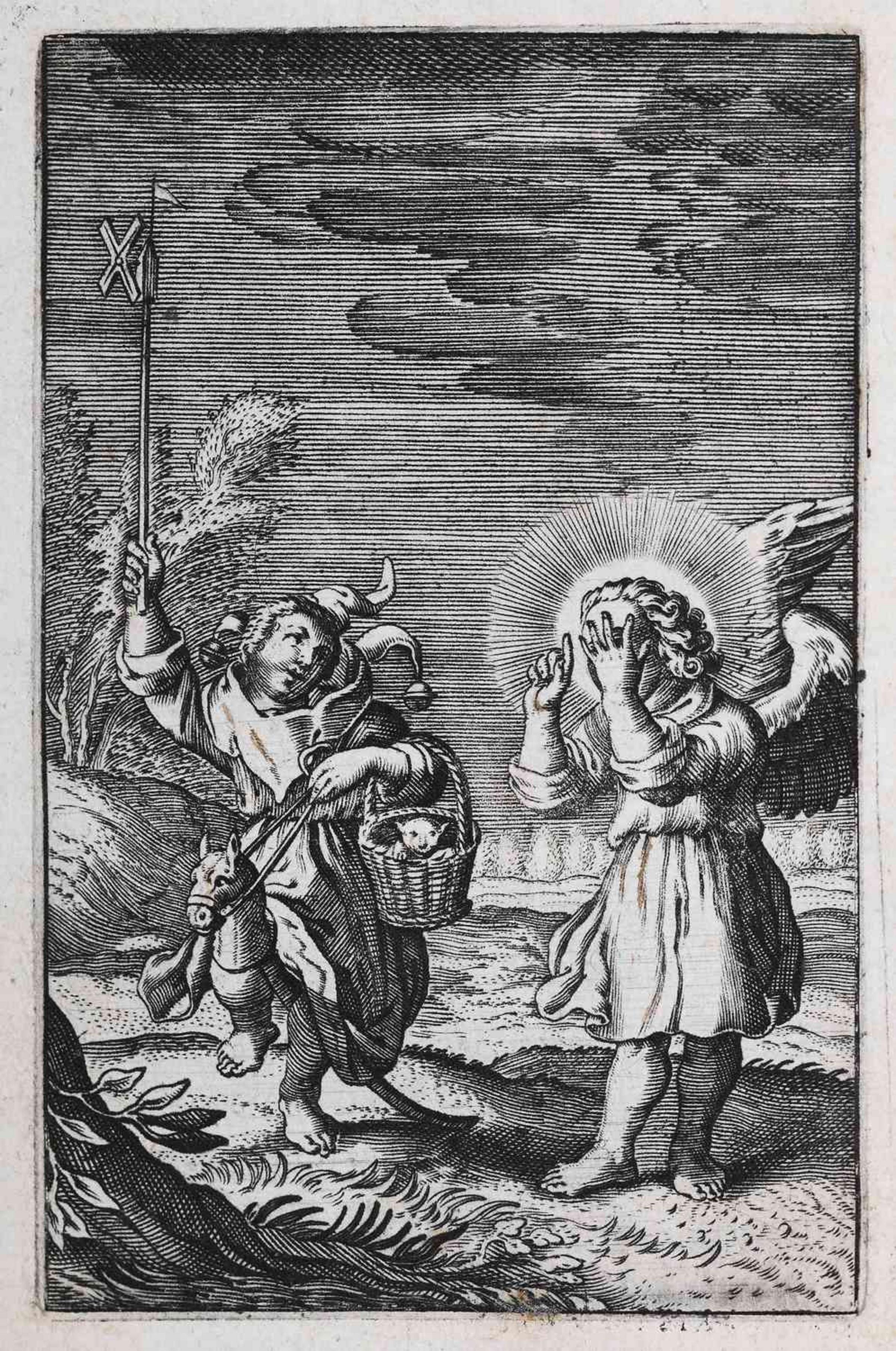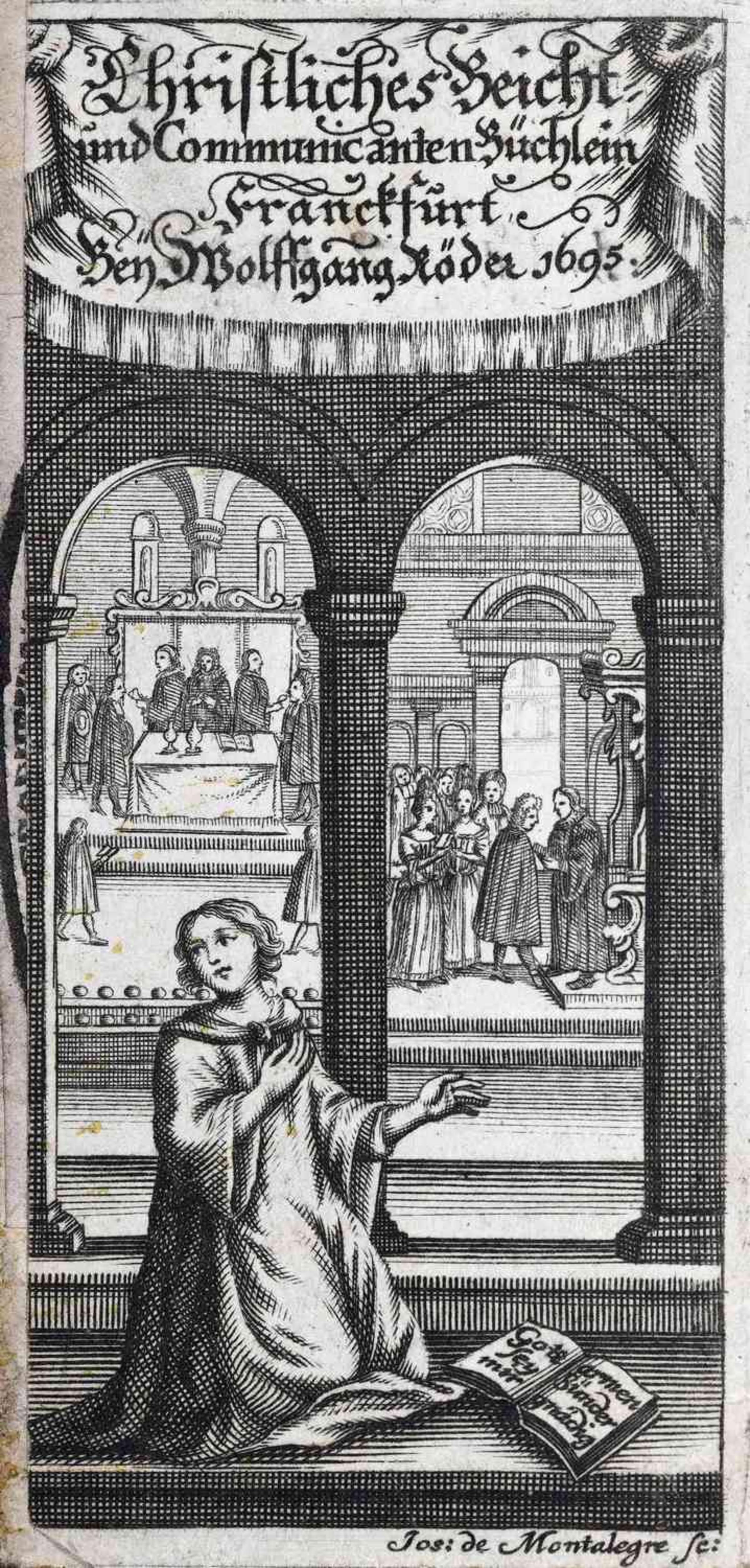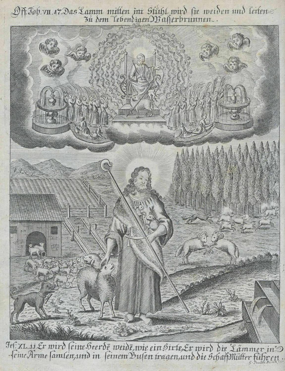 »Die Nachfolge Christi«. Bild V aus Reitz` Bildprogramm ist dem ebenfalls von Reitz` verfassten Lehrtraktat Die Nachfolge Jesu Christi von 1707 entnommen und stammt von dem Kupferstecher Gabriel Uhlich (1682–1741). Die Seele steigt nackt von der Schädelstätte auf einer Leiter zum Kreuz empor und lässt alle Attribute der Welt, umschlossen vom Teufelsring der Schlange, auf der Erde zurück. Eindringlich und drastisch wird so ihre Nachfolge auf dem Leidensweg Christi sowie die im Pietismus häufig genutzte Metapher vom ,Ausziehen des alten Adams‘ als Voraussetzung der Teilhabe an der Gnade Gottes versinnbildlicht. Die auf der Erde liegenden Totenköpfe, aus denen Blüten, Ähren und Reben hervorwachsen, stehen für das neue Leben, das Tod und Teufel überwindet.