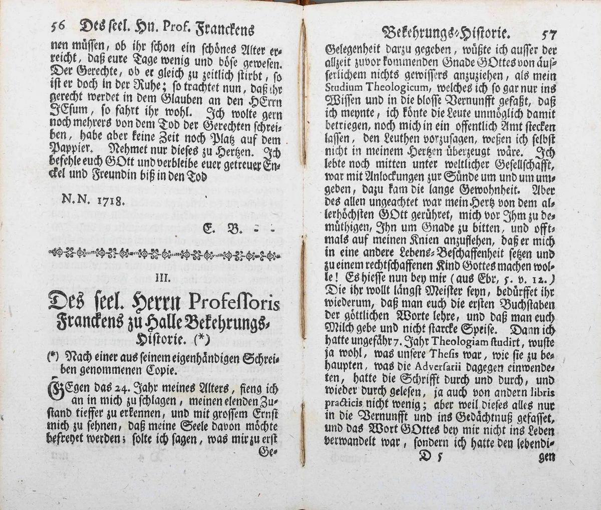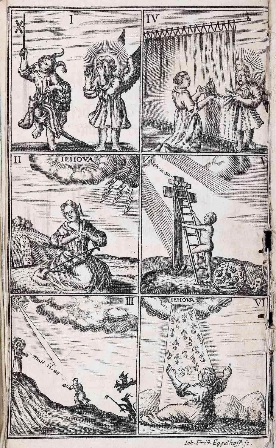 In der sechsteiligen Bildergeschichte in Johann Heinrich Reitz (1665–1729) Sammelbiographie Historie der Wiedergebohrnen wird der Weg des Christen von seiner Verstrickung in der Welt bis zu seiner Bekehrung und Wiedergeburt idealtypisch dargestellt. In der Bildallegorie trifft die personifizierte Seele auf die göttliche Liebe in kindlicher Gestalt mit Flügeln und Heiligenschein. Der Titel des Buches, der Kupferstich und die Beispielerzählungen vieler bekannter und unbekannter Männer, Frauen und Kinder jeden Standes sind aufeinander bezogen wie ein klassisches dreiteiliges Emblem mit Motto, Pictura (Bild) und Erläuterung. Der Titel übernimmt die Funktion des Mottos: »Wie Dieselbe [die Seele] erst von Gott gezogen [Bild I] und bekehret und nach vielen Kämpffen [Bild II] und Aengsten [Bild 3] durch Gottes Geist und Wort [Bild IV] zum Glauben [Bild V] und Ruh ihres Gewissens gebracht seynd« [Bild VI]. Die Erzählungen in dem gesamten Buch können als Deutung von Motto und Bildprogramm interpretiert werden. Der Kupferstecher Johann Friedrich Eggelhoff (1680–1731) entlehnte die Bildmotive I, II, IV und VI der frühbarocken, flämischen Emblematik in den Pia desideria des Jesuiten Hermann Hugo (1588–1629).