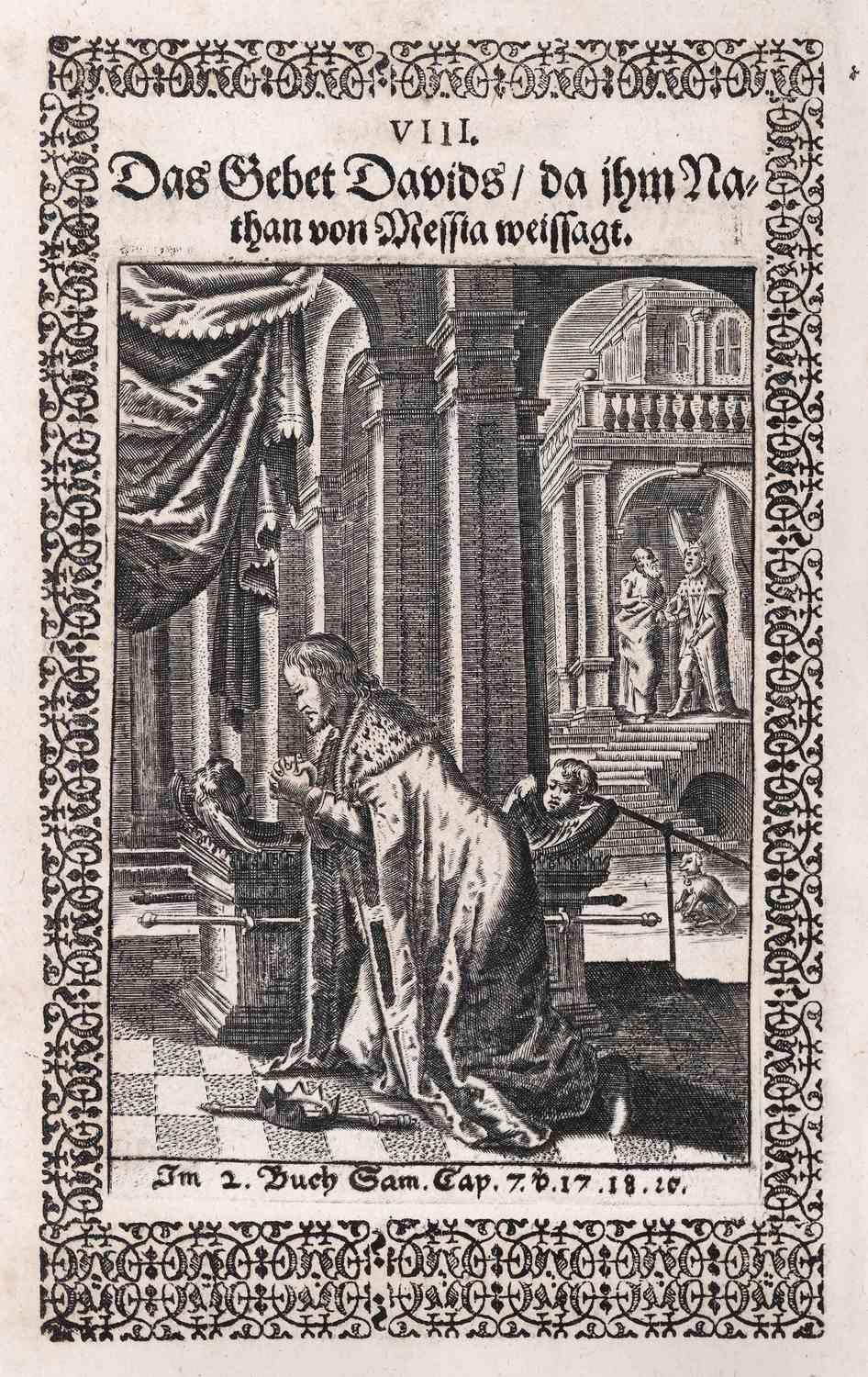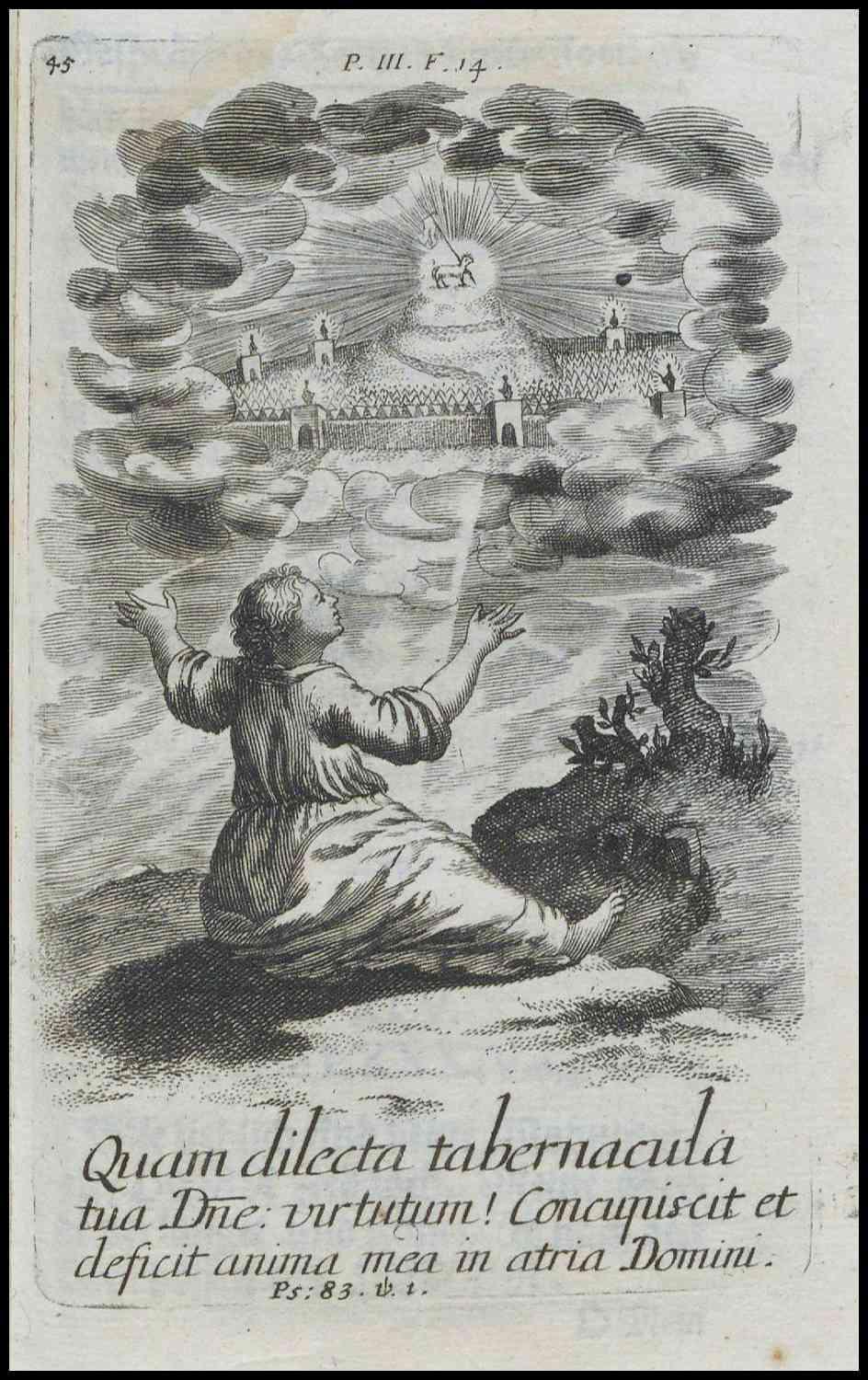 »Die Sehnsucht der Seele«. Diese Sehnsucht der Seele nach den Wohnungen des Herrn im himmlischen Jerusalem steht im Zentrum des Kupferstichs und der Gebetsmeditation von Johanna Eleonora Petersen (1644–1724), die sich in ihrem Hertzens-Gespräch mit Gott auf das Herz als Sitz der gefühlten Erkenntnis Gottes und auf die eigene religiöse Erfahrung berief. Die Sehnsucht der Seele füllt das Innere vollkommen aus und wird als innere Gewissheit wahrgenommen und empfunden, auf dem unumkehrbaren Weg zum neuen Jerusalem und damit zu Gott zu sein. Petersen orientierte sich an den Pia desideria Hermann Hugos. Das hier gezeigte Bildmotiv wurde in die protestantische Erbauungsliteratur aufgenommen, variiert und umgedeutet. An die Stelle der katholischen Darstellung mit Gott auf dem Himmelsthron treten bei Petersen das himmlische Jerusalem oder schlicht der Name Jehova in Reitz` Historie der Wiedergebohrnen.